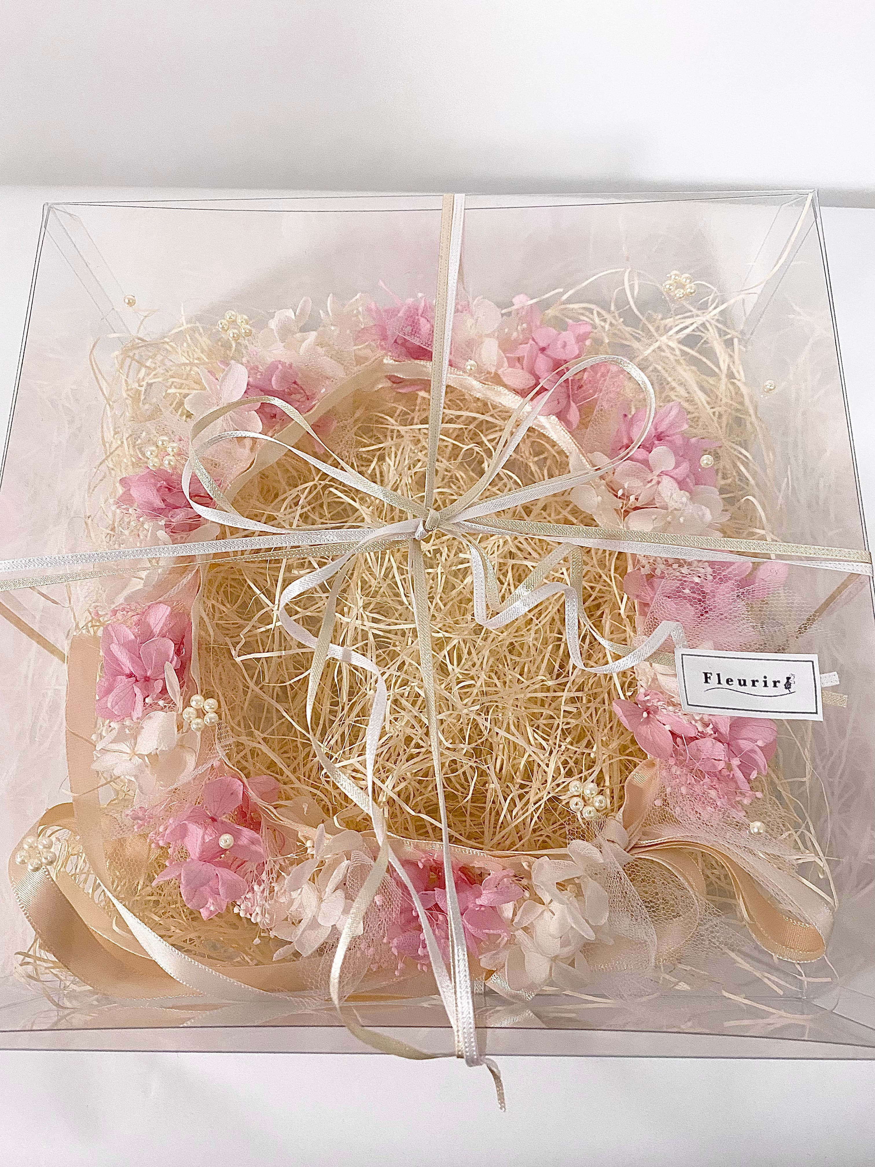 花冠はクリアケースにアイボリーとホワイトの細いリボンをつけてラッピングします✿.*・゚