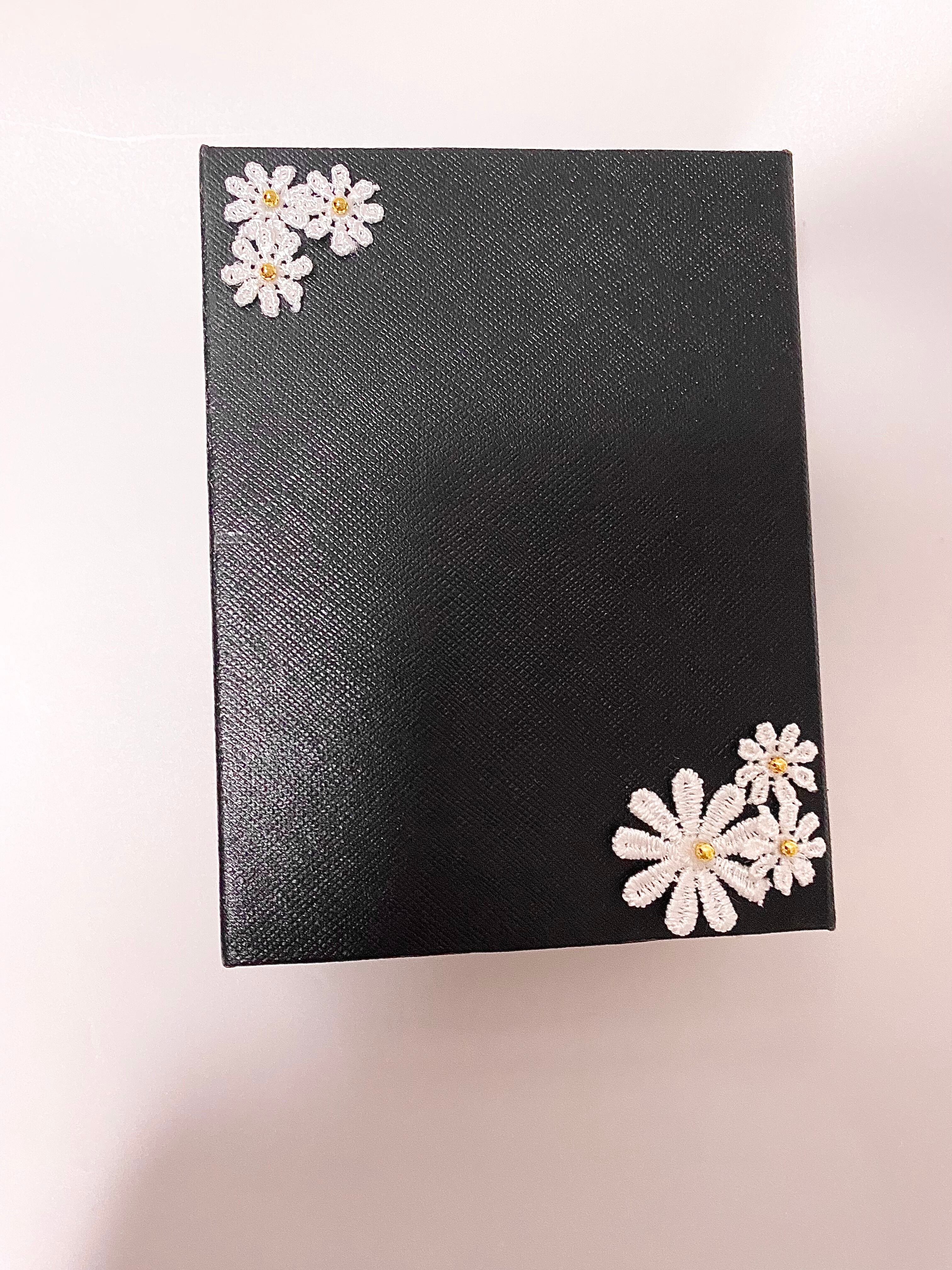BLACKの箱にシルバーのリボン、そこにレース素材のお花をあしらうことでシックになりすぎないラッピング箱となっております✿.*・゚